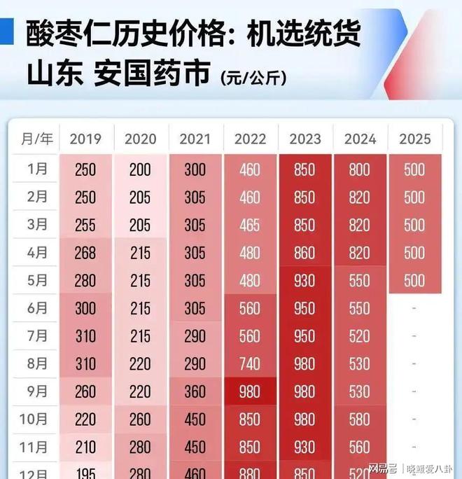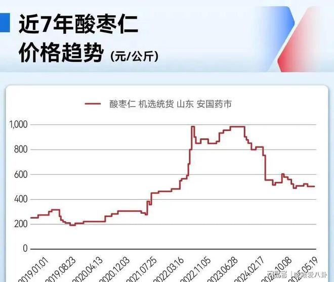 到了2023年,资本开始大规模入场。一批嗅觉灵敏的炒家瞄准酸枣仁的稀缺性,以900元/公斤的高价囤货,市场流通量骤减,价格被推至1050元/公斤的历史峰值。